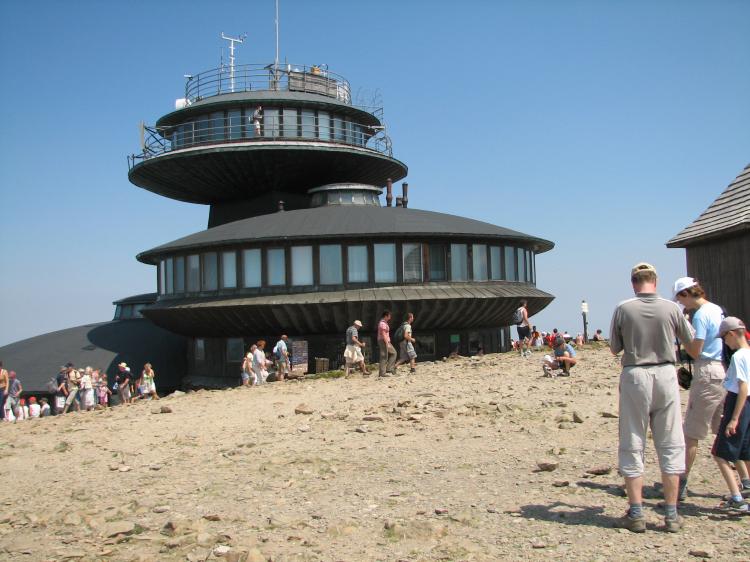 Od roku 1900 byla nejvýraznějším objektem na Sněžce osmnáct metrů vysoká dřevěná stavba meteorologické stanice jištěná proti silným poryvům větru ocelovými kotevními lany. V roce 1976 se meteorologové přestěhovali nové Polské boudy tvořené třemi spojenými objekty připomínajícími létající talíře. Původní dřevěná stanice byla v roce 1990 rozebrána a snesena do údolí.